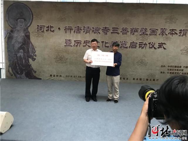 7月6日,行唐县清凉寺三菩萨壁画摹本暨历史文化展览在石家庄市美术馆开展。图为郝建文向行唐县捐赠摹本。 记者任学光摄
