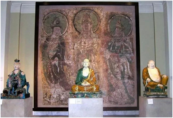 行唐清凉寺三菩萨壁画原作高4米,宽3.9米,接近正方形,现展存于英国伦敦大英博物馆,是该馆收藏的单幅壁画中面积最大、画幅最高的壁画作品,也是该馆中国馆的镇馆之宝之一。其色调金红,富丽堂皇,画面上三尊菩萨像,面庞丰腴,体态雍容,衣饰华丽,栩栩如生。壁画原在行唐县清凉寺内,由五台山僧人创作,始绘于1424年,最终完工于1468年。民国时期该壁画被分割成12块,流失海外,而原清凉寺已不复存在。