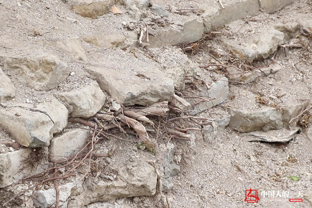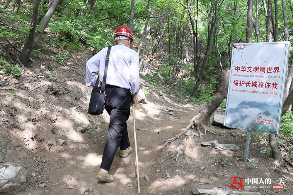 上下山一趟要徒步2个多小时,程永茂戴着一顶红色安全帽,背包里装着粮食和水,拄着一根细拐杖,将众人远远甩在身后。上长城的山路,他已经走了几百次。