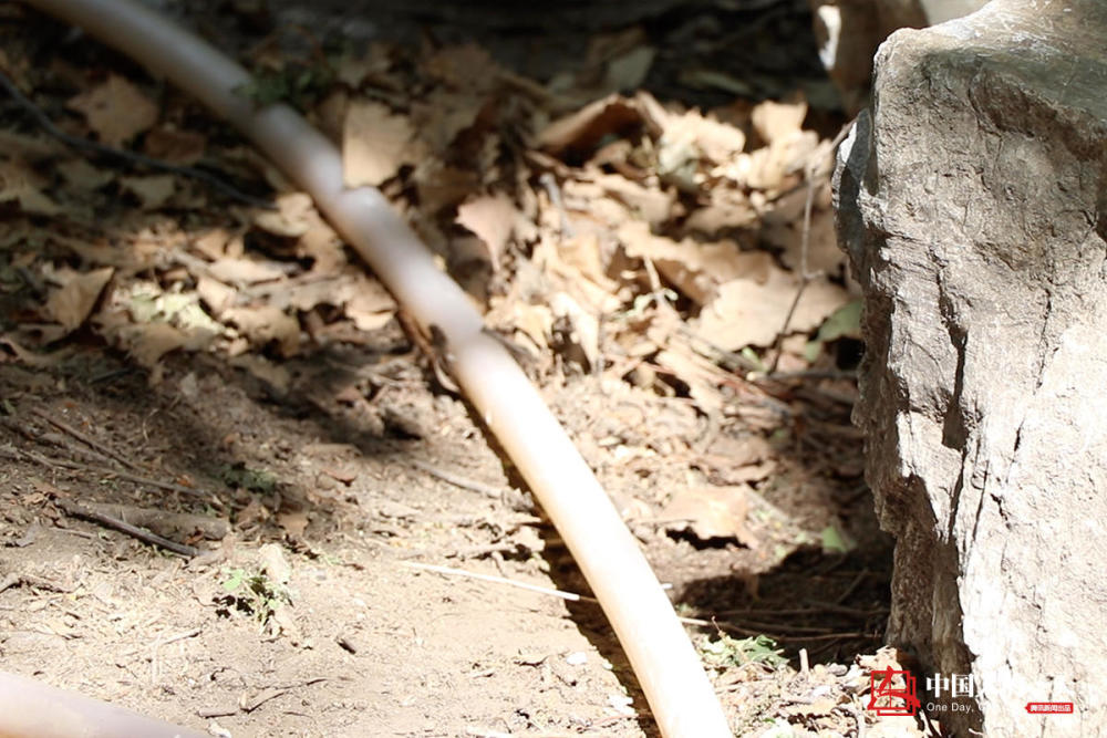 沿路的草丛里一条水管蜿蜒上山。此次修缮工程所在区域严重缺水,需要从山下铺设3500米管道上山保证施工用水。