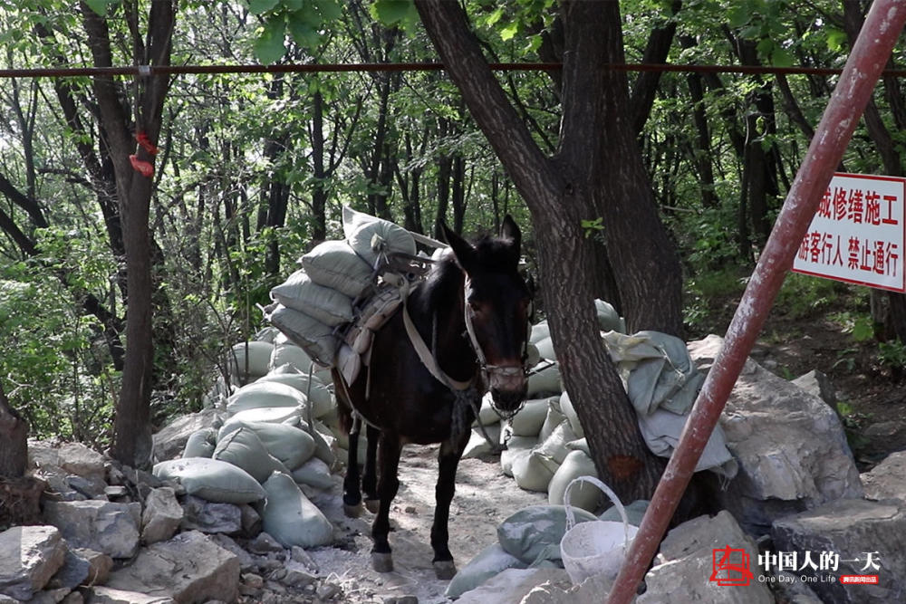 箭扣长城的修缮难度,主要还是材料的上山运输。山路无法通车,只能用骡子驮料。程永茂说,平均一头骡子每天需要上山六趟,驮料约0.8吨。最多的时候每天有近22头骡子,一天驮料近18吨。程永茂说:“没有别的办法,因为是高山上运输,成本、条件也不允许架索道。”骡子只能到长城边缘,最后材料由工人们背上长城。