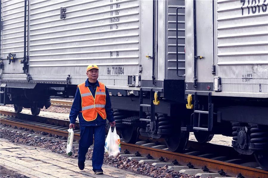 东江琦上次值乘的304列机械冷藏车组运送的是一批速冻水饺和汤圆。列车停靠新丰镇站后,东江琦戴上安全帽,拿上列检锤,插上红旗,按照要求对车组进行列检作业,重点检查车辆走行部。