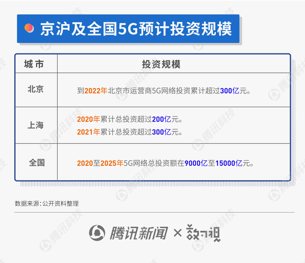 5G的建设离不开大量的资金投入,2020年至2025年,我国预计投入九千亿至一万五千亿用于建设5G网络。北京、上海两座城市作为5G发展的前沿地带,对之后三年的5G投资情况做出了预算。