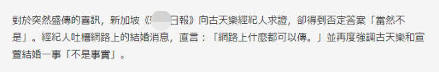 有媒体致电古天乐经纪人求证结婚一事,经纪人否认称:“当然不是”,经纪人吐槽网传结婚的消息称:“网络上什么都可以传”,强调古天乐和宣萱结婚一事不是事实。