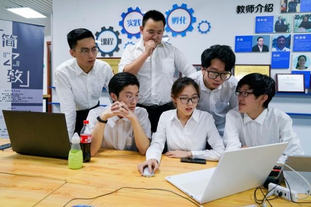 在北京市贯通培养试验项目试点高职院校——北京财贸职业学院,参与贯通培养试验项目的视觉传播与设计专业学生在老师的指导下一起探讨学习。 新华社记者 沈伯韩 摄