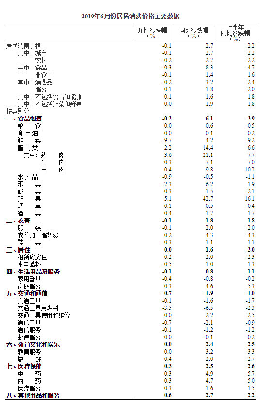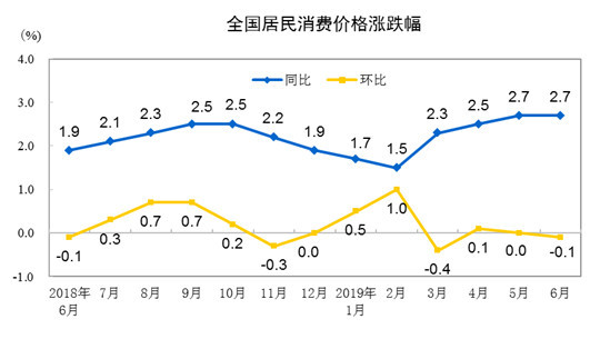 2019年6月份,全国居民消费价格同比上涨2.7%。其中,城市和农村均上涨2.7%;食品价格上涨8.3%,非食品价格上涨1.4%;消费品价格上涨3.2%,服务价格上涨1.8%。上半年,全国居民消费价格比去年同期上涨2.2%。