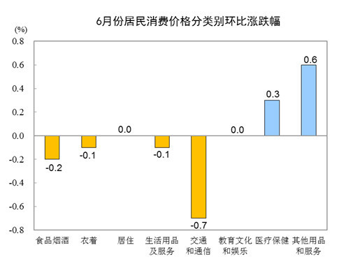 6月份,全国居民消费价格环比下降0.1%。其中,城市下降0.1%,农村下降0.2%;食品价格下降0.3%,非食品价格下降0.1%;消费品价格下降0.2%,服务价格上涨0.1%。