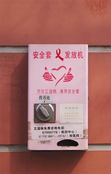 2016年3月24日,郑州大学校园内一栋宿舍楼外墙上安装的安全套发放机。资料图片/视觉中国