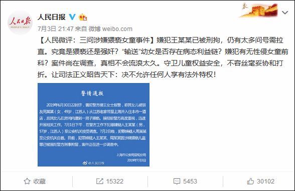 7月3日,人民日报发表微评“三问涉嫌猥亵女童事件”评论称,嫌犯王某某已被刑拘,仍有太多问号需拉直。究竟是猥亵还是强奸?“输送”幼女是否存在病态利益链?嫌犯有无性侵女童前科?案件尚在调查,真相不会流浪太久。守卫儿童权益安全,不容丝毫妥协和打折。