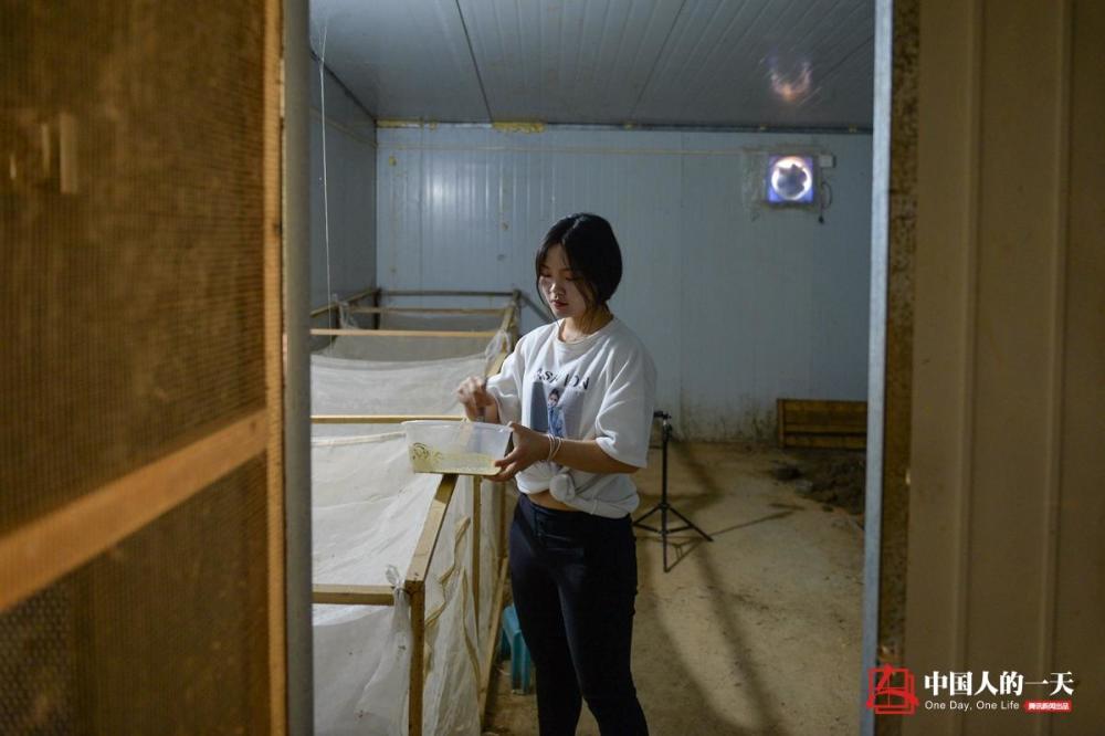 程程正在搅拌鱼粉和生鸡蛋,由于生病或其他原因,部分大王蛇不主动进食,甚至会饿死,只能通过人工注射器将食物灌喂给它们。程程轻轻地将纱帘上的拉链打开,把蛇从蛇棚里拿出来灌喂。