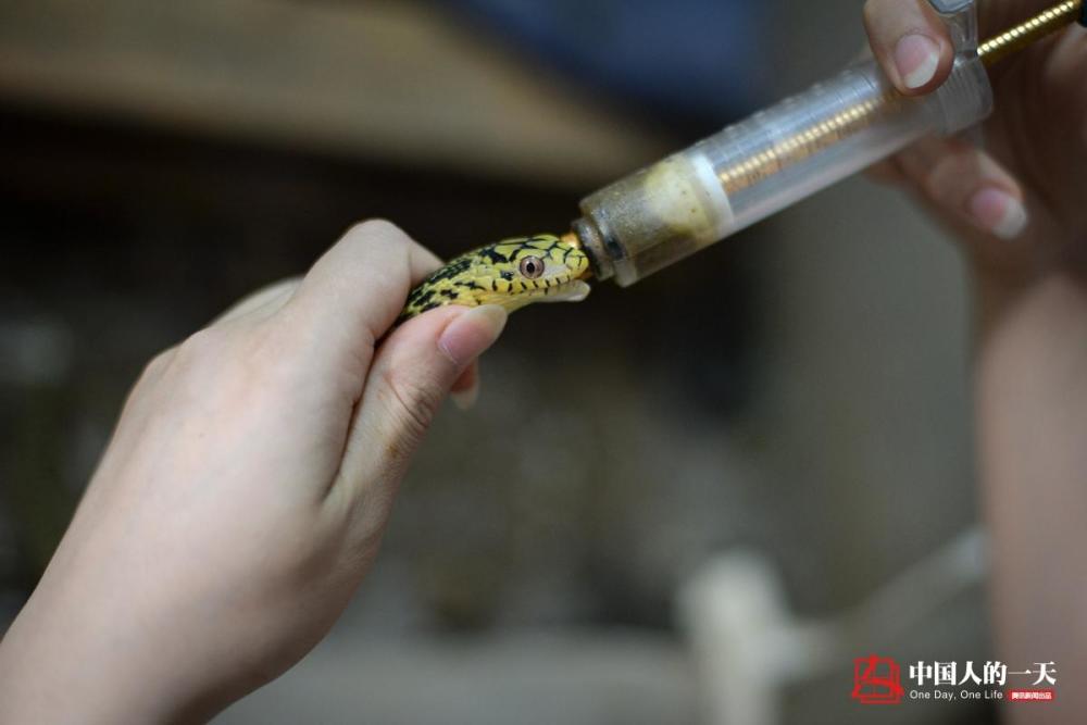 程程熟练地抓起蛇的头部,用注射器将食物灌到蛇的嘴里。去年十月,刚开始学习喂蛇的程程总是手抖,不仅是对蛇有恐惧心理,更是害怕会伤害到蛇。“注射器的头如果刮到蛇的牙齿,那个蛇就会得口腔炎,喂得太多,蛇吐食的话就会得肠炎。”程程在灌喂过程中也能观察到每条蛇的状态,健康或不健康的蛇通过眼睛、皮肤就能感受出来。