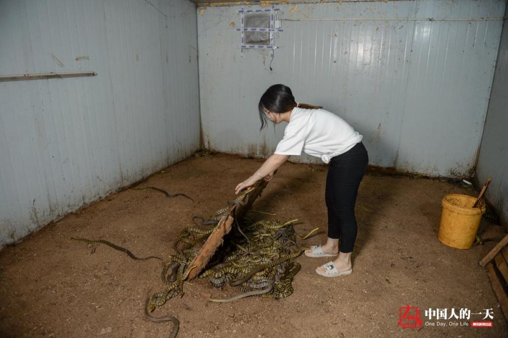 程程提着两块从蛇房里取出的大木板,准备清洗晾晒。有些房间里饲养着眼镜蛇,它们不时发出“呼呼”的声音,令人毛骨悚然。
