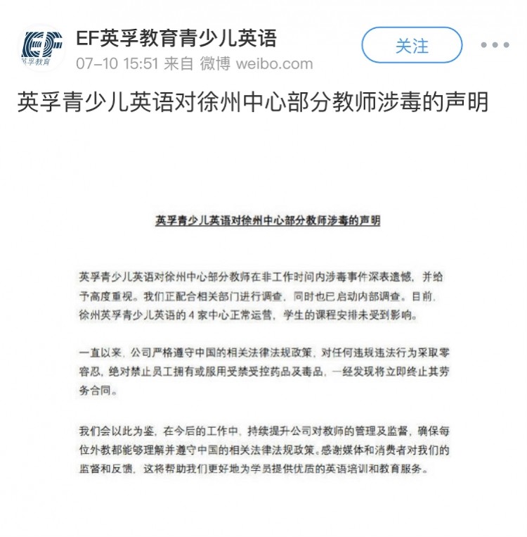 7月10日下午,英孚教育青少儿英语就徐州中心7名外教因吸毒被抓事件作出回应,称正配合相关部门调查,对违规违法行为零容忍,禁止员工拥有或服用受禁受控药品及毒品,发现即终止其劳务合同,今后将提升对教师的管理及监督。