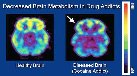健康的大脑与可卡因成瘾的大脑,先破坏你意志力的生理基础...(图片来自wikipedia)