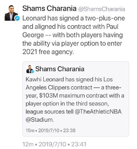 这个夏天快船成为自由球员市场上最大赢家,他们一口气得到了伦纳德和乔治两名超级球星。根据此前沃神的报道,伦纳德当初决定选择快船,最大的原因就是因为乔治。如今,伦纳德选择3年2加1的合同,也是想要跟乔治共进退。这是因为乔治当初跟雷霆续约,目前合同还剩下2年。