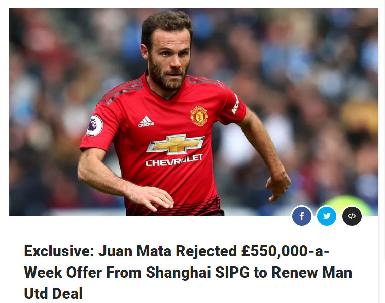 原标题:周薪55万英镑!英媒曝上港惊天报价挖曼联天王 4倍薪水仍被拒