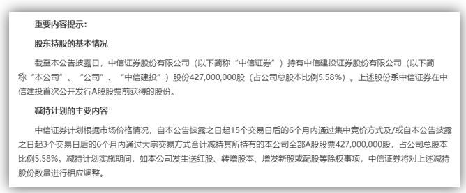 2018年6月,中信建投刚刚在上交所挂牌上市,中信证券的持股比也从7%稀释至5.58%。而就在解禁不久,中信建投便公告称,中信证券将清仓减持4.72亿股,减持金额约为113亿元,而且减持将从公告披露之日起15个交易日后的6个月内通过集中竞价方式或自公告之日起的3个交易日后的6个月内通过大宗交易方式减持。