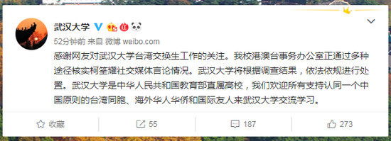 武汉大学官方微博回复全文如下:感谢网友对武汉大学台湾交换生工作的关注。我校港澳台事务办公室正通过多种途径核实柯筌耀社交媒体言论情况。武汉大学将根据调查结果,依法依规进行处置。武汉大学是中华人民共和国教育部直属高校,我们欢迎所有支持认同一个中国原则的台湾同胞、海外华人华侨和国际友人来武汉大学交流学习。