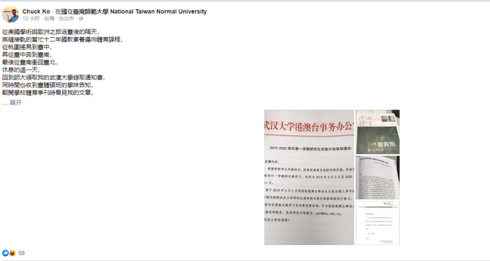 柯筌耀发文称自己成为武汉大学的交换生。