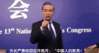 2018年两会期间,外交部部长王毅答记者问。在会议结束准备离场时,有记者大声喊话:“外长,对近来侮辱南京大屠杀遇难者等‘精日’分子挑衅民族底线的行为,您怎么看?”王毅严肃地回应并怒斥:“中国人的败类!”