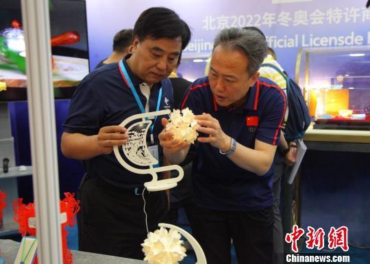 7月11日,北京冬奥组委举办2019年首次北京冬奥会特许商品订货会。图为北京冬奥组委市场开发部部长朴学东在订货会现场了解各种特许商品。北京冬奥组委供图