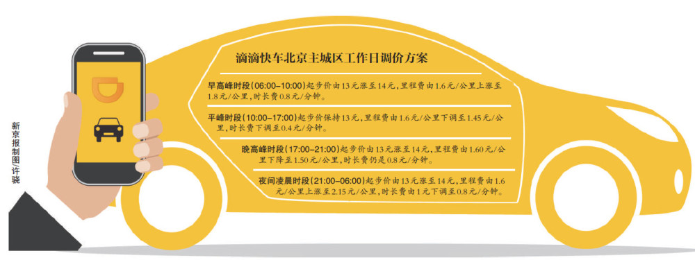 此次价格调整涉及快车、优享、专车等服务车型,包括工作日与休息日的调整。以第一区域北京主城区为例,工作日期间,早高峰时段(06:00-10:00)滴滴快车的起步价、里程费均上涨、时长费不变。起步价由13元涨至14元,里程费由1.6元/公里上涨至1.8元/公里,时长费依然是0.8元/分钟。