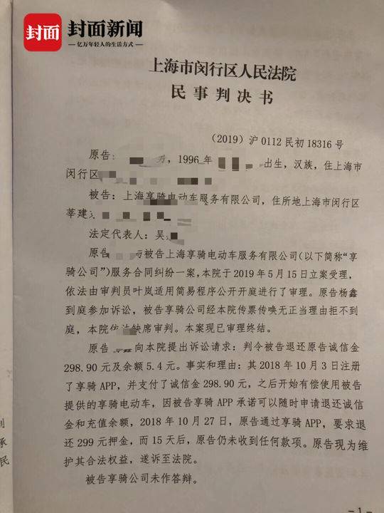 记者在其提供的民事判决书中看到,法院针对该案进行了公开开庭审理,原告阳鑫到庭参加诉讼,被告上海享骑电动车服务有限公司及法定代表人,经法院传票呼唤无正当理由拒不到庭,也未作答辩。