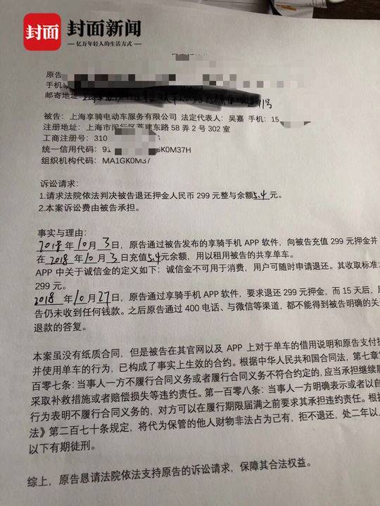 男子为讨299元共享电动车押金 花25元将企业诉至法院 还打赢了官司