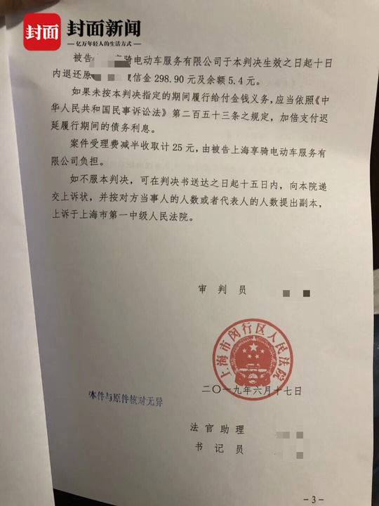 6月17日,法院判决被告上海享骑电动车服务有限公司于判决生效之日起十日内退还阳鑫诚信金298.9元及余额5.4元。