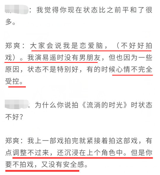 为什么说拍《流淌的时光》状态不好?郑爽给出的解释是:拍完上一部戏就拍了这部戏,调整不过来,还沉浸在上一个角色中。但是如果不拍戏,郑爽又会觉得没有安全感。换句话说,当时郑爽入戏太深,又接新戏,所以没能及时调整自己。