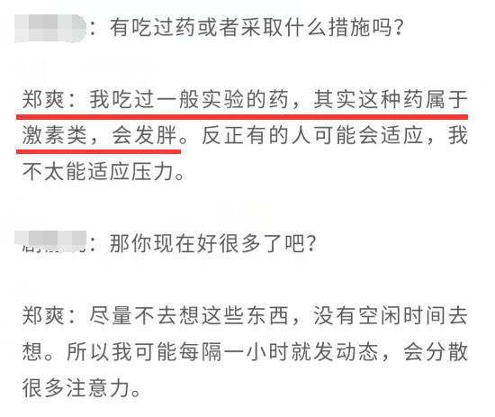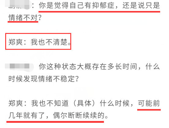 记者问郑爽是感觉自己得抑郁症,还是仅仅是情绪不对?郑爽也说自己不清楚,表示前几年就有了,偶尔断断续续。郑爽表示自己吃过药来控制情绪,但是这种要都是激素类药物,吃了会变胖。