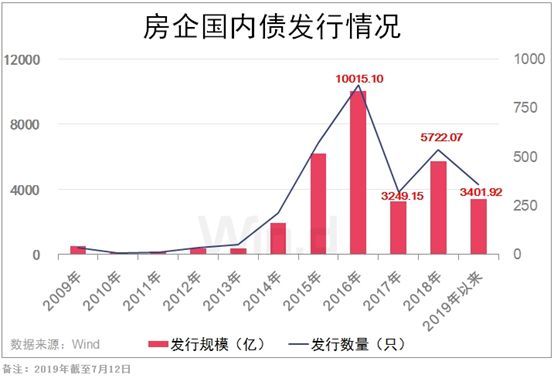 Wind统计显示,2019年以来,房企国内计划发债数量已达359只,计划发行规模3401.92亿元,其中发行数量已超2017年全年,发行规模也逼近2017年全年。