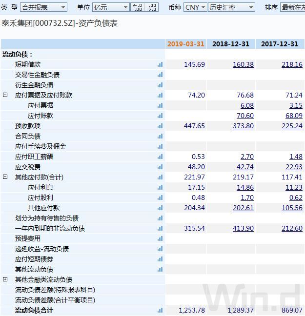 泰禾集团2019年一季度的报告显示,公司总资产2472.78亿元,同比增加1.7%;营业收入74.53亿元,同比增长24.47%;归属于上市公司股东的净利润9.72亿元,同比增加308.95%;手中持有的货币资金约206.42亿元,经营活动产生的现金流量净额119.38亿元,流动负债总额共1254亿元,短期借款145亿元,一年内到期的非流动负债315.5亿元。