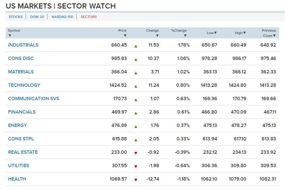 标普500指数11个板块中有8个板块上涨,3个板块下跌。其中,工业和消费者非必需品板块领涨,医疗保健板块领跌。