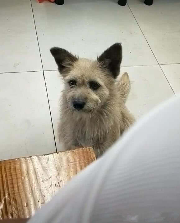 这只流浪狗狗肚子早就饿的不行了,可是狗狗没有直接到顾客的餐桌底下去。狗狗有意识的保持了一个安全的距离,既不想让顾客误会,又不想让自己受到伤害。狗狗端端正正的蹲坐在地上,它竟然开始认真的冲顾客作揖拜拜。