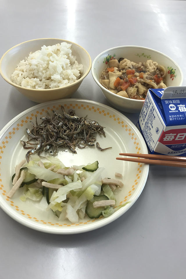 加了15%糙米的米饭、日式麻婆豆腐、火腿炒白菜、小鱼干、鲜牛奶,这就是一份日本五六年级小学生的午餐。配餐中心介绍说,食谱是按照政府统一规定,根据热量和主要营养成分搭配出来的。