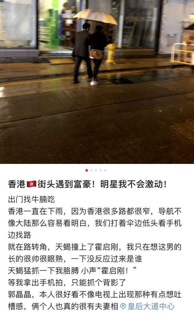 7月14日星期天,有网友在香港偶遇了霍启刚郭晶晶两夫妻,他们现身中环荷里活道的“大馆”,不知道是欣赏演出还是吃饭。