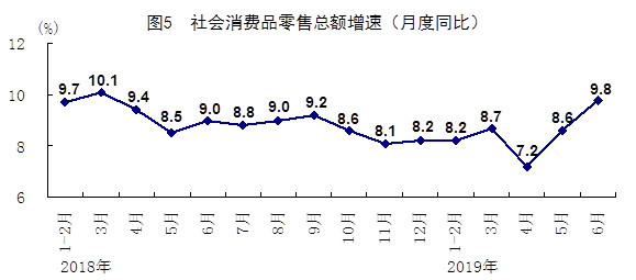 上半年,社会消费品零售总额195210亿元,同比增长8.4%,增速比一季度加快0.1个百分点。6月份,社会消费品零售总额33878亿元,同比增长9.8%,比上月加快1.2个百分点,环比增长0.96%。上半年,按经营单位所在地分,城镇消费品零售额166924亿元,同比增长8.3%;乡村消费品零售额28286亿元,增长9.1%。按消费类型分,餐饮收入21279亿元,增长9.4%;商品零售173930亿元,增长8.3%。消费升级类商品销售增长较快,限额以上单位化妆品类同比增长13.2%,增速快于社会消费品零售总额4.8个百分点。