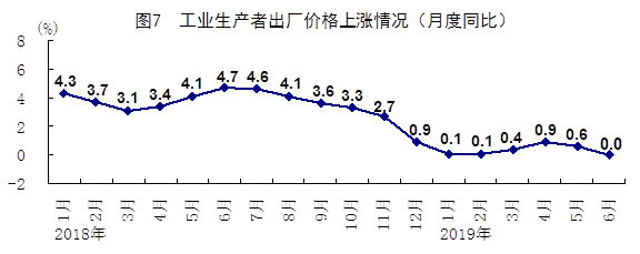 上半年,全国工业生产者出厂价格同比上涨0.3%,涨幅比一季度扩大0.1个百分点。6月份,全国工业生产者出厂价格同比持平,环比下降0.3%。上半年,全国工业生产者购进价格同比上涨0.1%,涨幅与一季度持平。6月份,全国工业生产者购进价格同比下降0.3%,环比下降0.1%。