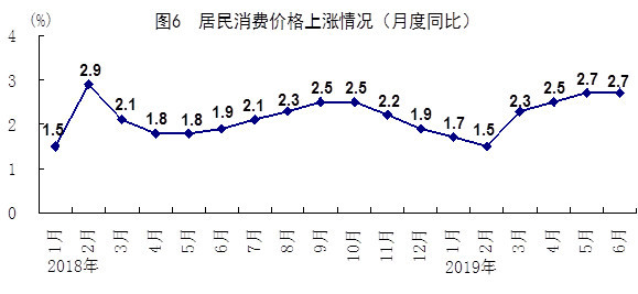 上半年,全国居民消费价格同比上涨2.2%,涨幅比一季度扩大0.4个百分点。其中,城市和农村均上涨2.2%。分类别看,食品烟酒价格同比上涨3.9%,衣着上涨1.8%,居住上涨2.0%,生活用品及服务上涨1.1%,交通和通信下降1.0%,教育文化和娱乐上涨2.5%,医疗保健上涨2.6%,其他用品和服务上涨2.2%。在食品烟酒价格中,粮食价格上涨0.5%,猪肉价格上涨7.7%,鲜菜价格上涨9.2%。扣除食品和能源价格后的核心CPI同比上涨1.8%,涨幅比一季度回落0.1个百分点。6月份,全国居民消费价格同比上涨2.7%,涨幅与上月持平;环比下降0.1%。