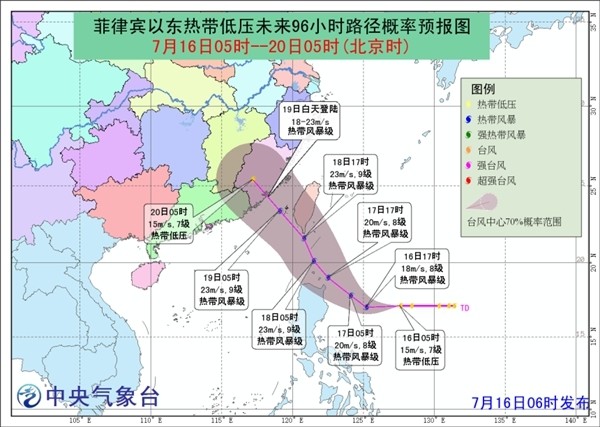 中国天气网讯 中央气象台7月16日06时发布热带低压预报: