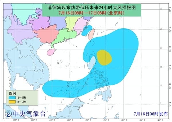 大风预报:7月16日08时至17日08时,巴士海峡、台湾东南沿海以及洋面、南海东北部的偏东海域和南海南部、台湾海峡将有6-7级大风,菲律宾以东部分洋面风力可达8-9级。