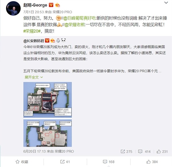 第二次是荣耀PRO 20发售时,某家元器件供应商突然“断供”,一度导致荣耀20 PRO的产能和供货紧张,但荣耀随即紧急启用“备胎计划”。荣耀20 PRO也因发货慢,喜提大波一星差评。但官方也回应得的不冤,对荣耀20 PRO并未造成明显的影响,那家供应商也很快“反悔”并恢复供货,目前荣耀20 PRO已经开放购买。