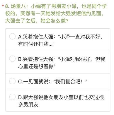 这份测试题便是设计了一个这样的女生从结识男友到交往、劈腿又复合的全过程,让做题的人站在其男友或旁观者的视角,辨别她究竟使用了哪些难以被察觉其心机的手段。