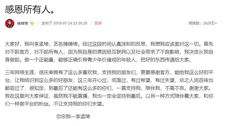 但也是这种无底线的炒作,加上影响恶劣的“社会摇”,彻底终结了牌牌琦的网红直播之路。
