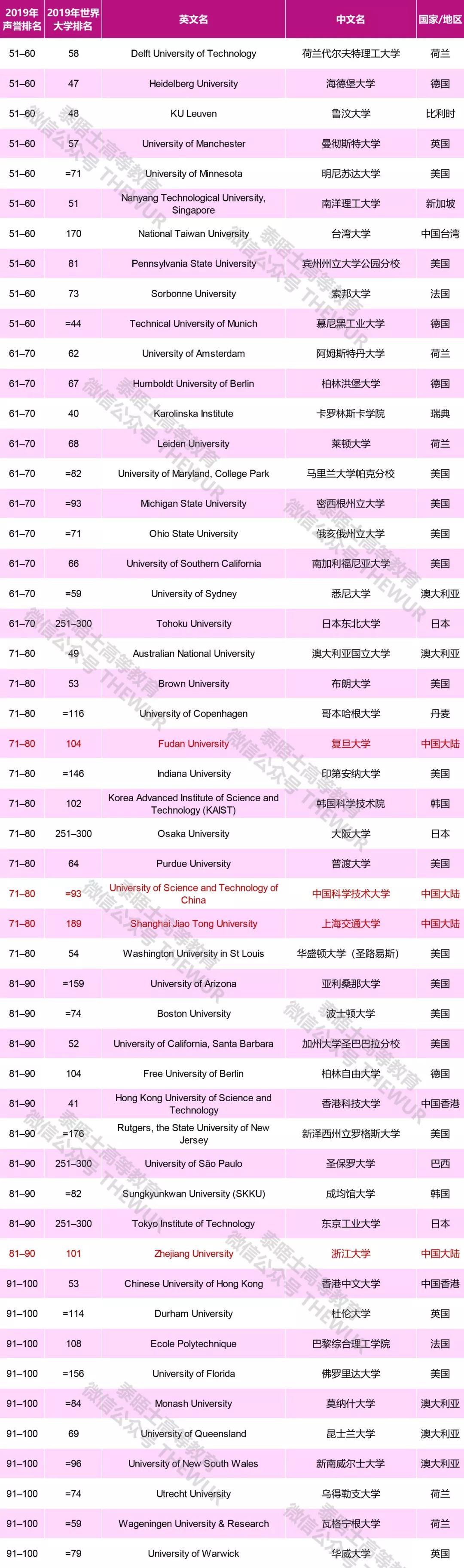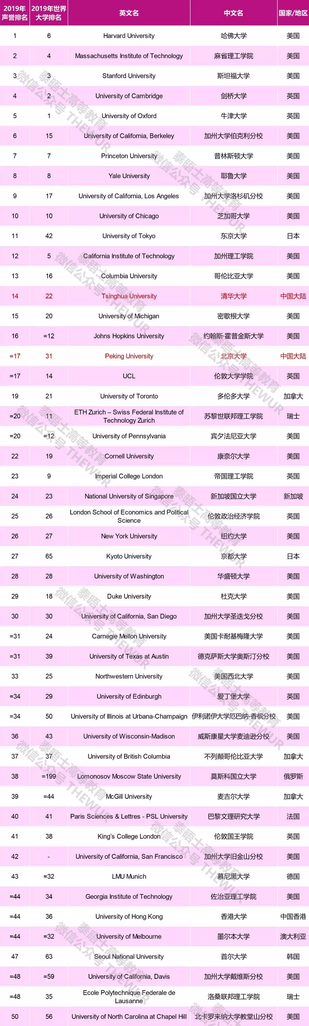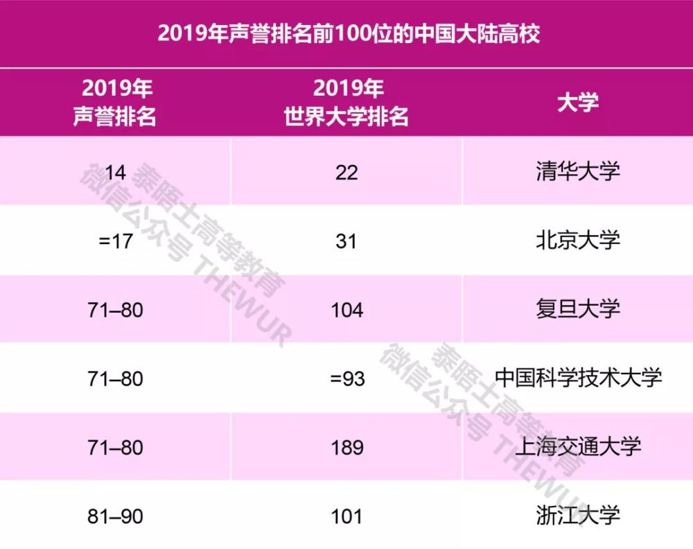 7月17日,泰晤士高等教育发布2019年“世界大学声誉排名”。前100名中有6所中国大陆高校,它们是清华大学、北京大学、复旦大学、中国科学技术大学、上海交通大学和浙江大学。其中清华大学位列世界14名,居国内大陆高校首位。
