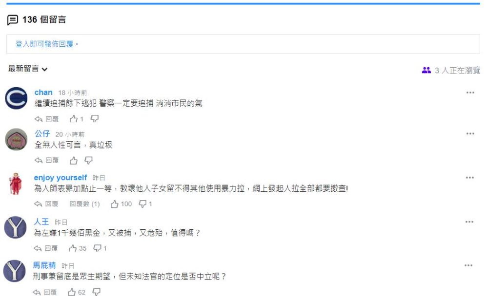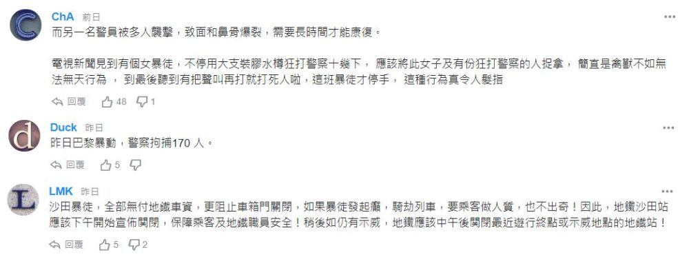 Yahoo新闻(香港)聚合了多家港媒的报道,在《东方日报》昨日所发的《沙田冲突共拘47人》文下,有136条留言,全部为批评、责骂袭警者的话语。
