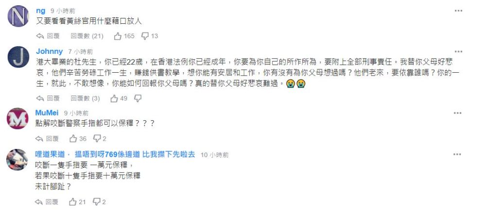 看看网民的留言就清楚了,香港广大市民对这种行为也着实生气。被捕者中还有教师,怪不得这么多学生涉及其中,原来是有人在误人子弟(咬断警员手指的就是一名22岁的港大应届毕业生)。