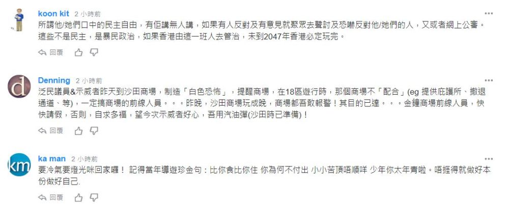 所谓他/她们口中的民主自由,自说自话,如果有人反对及有意见就聚众去声讨及恐吓反对他/她们的人,又或者网上公审,这些不是民主,是暴民政治,如果香港由这一班人去管治,未到2047年香港必定玩完。