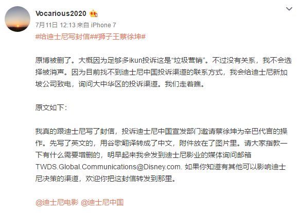 在解释为何不支持蔡徐坤参与此次活动时,给迪士尼官方投递投诉信的微博网友@Vocarious2020表示“我很沮丧地看到蔡代表辛巴……”这一微博也在网络上得到了很多网友的响应,表示“蔡徐坤和辛巴并无太多联系,让他来代言显得十分奇怪”。